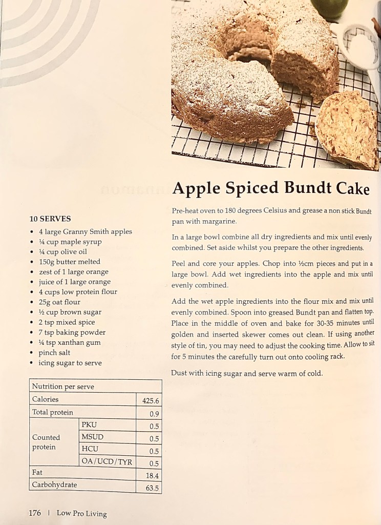 Apple Bundt cake is a delightful dessert that captures the essence of fall with its warm spices and juicy apple pieces. This review will focus on a low-protein apple Bundt cake recipe adapted from the Low Pro Living Cookbook developed by Sasha Cranwell, mother of a PKU child. The recipe stands out for its simplicity, flavour, and versatility.