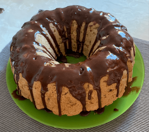 Mix the dry and wet ingredients well, add them to the Bundt pan, level the mix with a spoon, and leave it in the oven for 35 min.